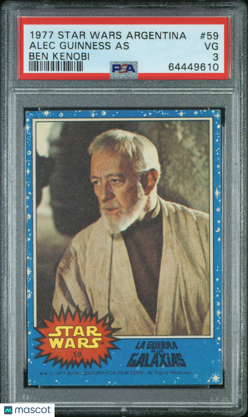 You are purchasing a 1977 Star Wars Argentina Stani Alec Guinness As Ben Kenobi #59 PSA 3. You will receive the exact item in the photographs. Thank you for looking. Listed With Mascot.