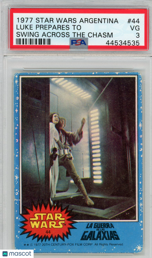 You are purchasing a 1977 Star Wars Argentina Stani Luke Prepares To Swing Across The Chasm #44 PSA 3. You will receive the exact item in the photographs. Thank you for looking. Listed With Mascot.