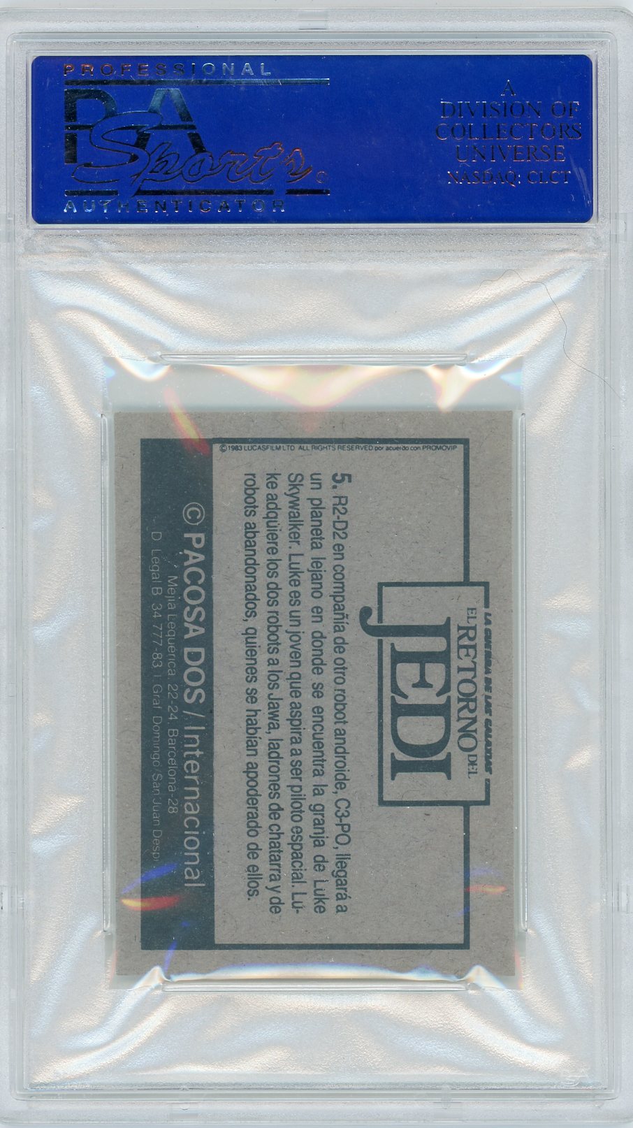 You are purchasing a 1983 Pacosa Dos El Retorno Del Jedi R2-D2 EN Comania.. . #5 PSA 10. You will receive the exact item in the photographs. Thank you for looking. Listed With Mascot.