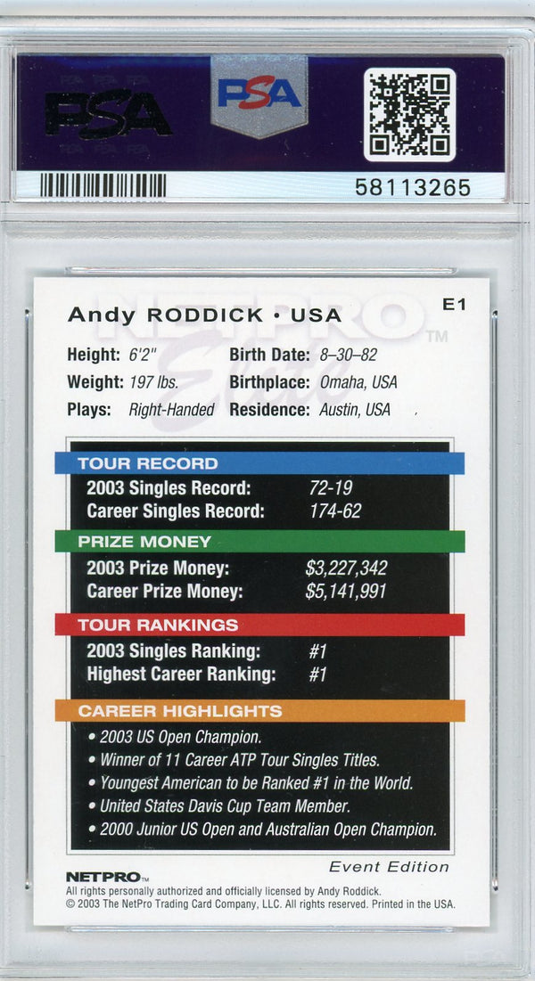 2003 Netpro Elite Andy Roddick #E1 Event Edition PSA 10