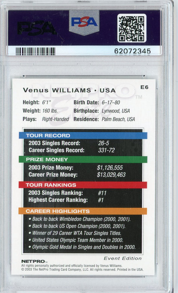 2003 Netpro Elite Venus Williams #E6 Event Edition PSA 10