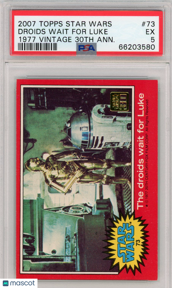 You are purchasing a 2007 Topps Star Wars 1977 Vintage 30th Anniversary Stamped Card Droids Wait For Luke #73 PSA 5. You will receive the exact item in the photographs. Thank you for looking. Listed With Mascot.