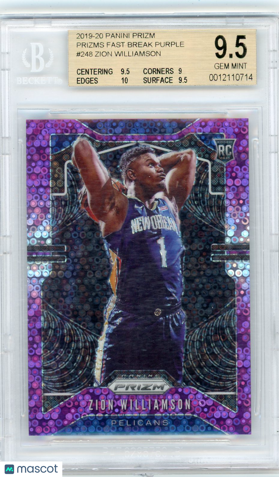 You are purchasing a 2019 Panini Prizm Basketball Zion Williamson #248 Fast Break Purple Prizm BGS 9.5. You will receive the exact item in the photographs. Thank you for looking. Listed With Mascot.