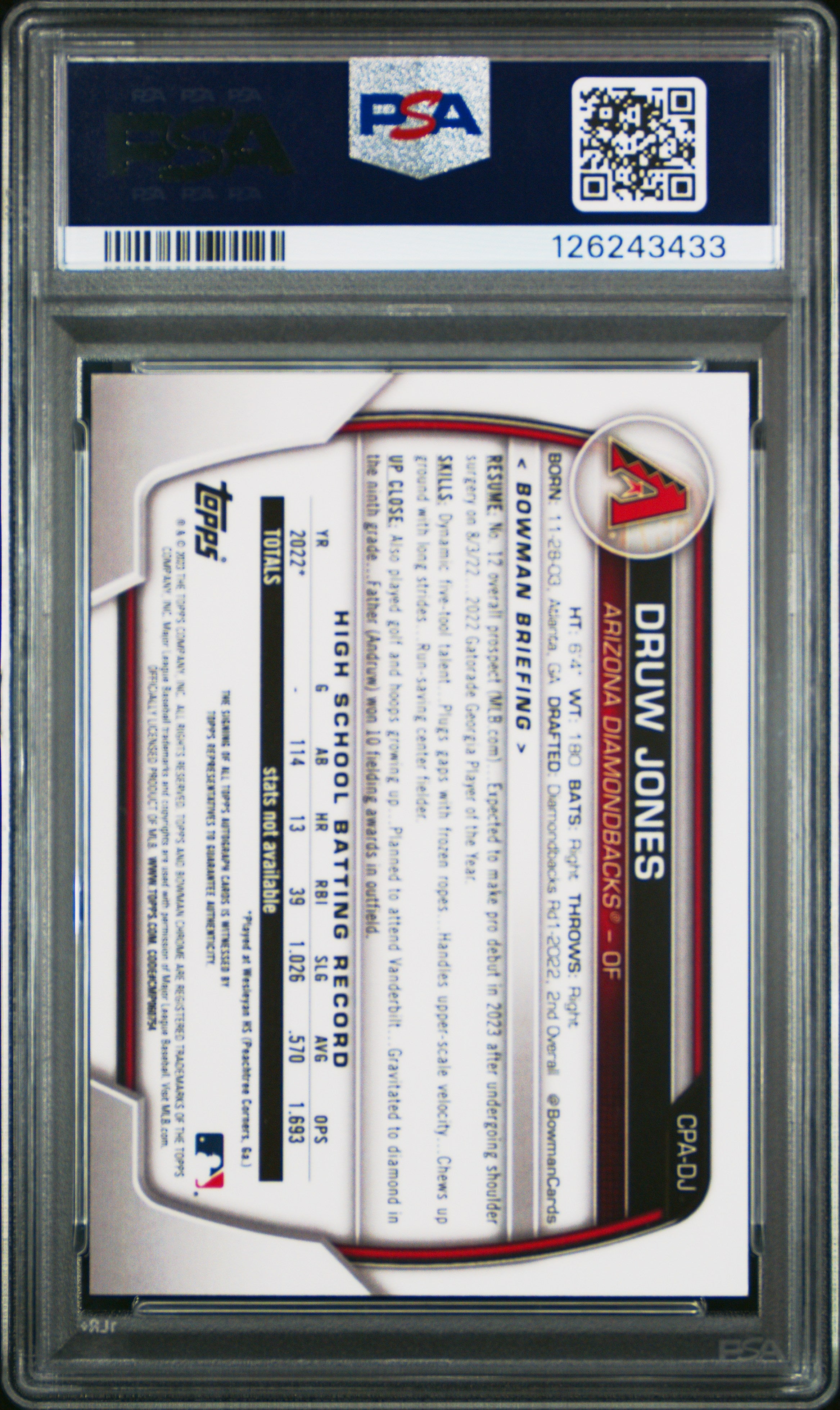 2023 Bowman Chrome Prospect Autographs Druw Jones #CPADJ Blue Ref 094/150 PSA 9