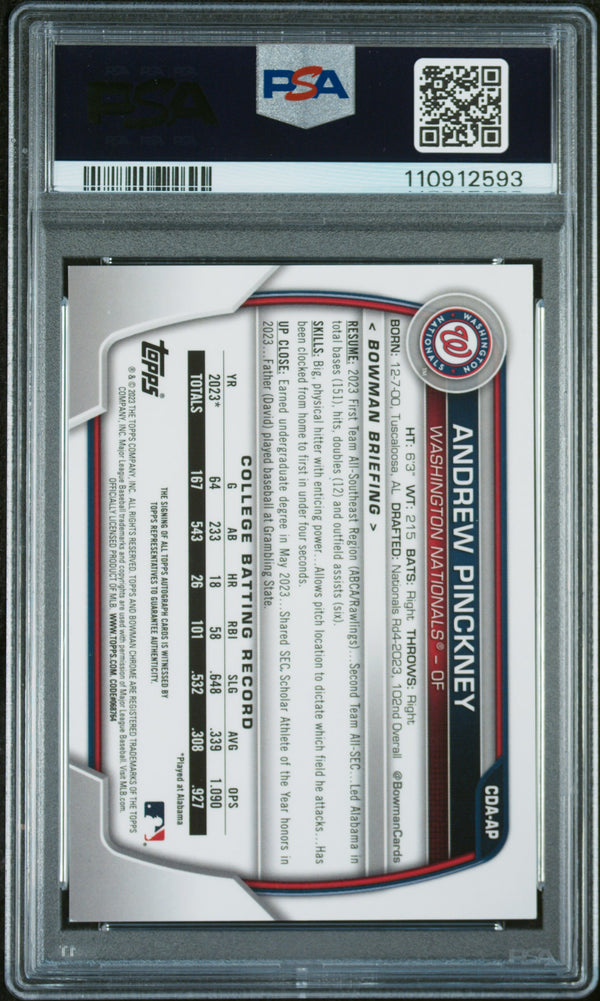 You are purchasing a 2023 Bowman Draft Chrome Prospect Autograph Baseball Andrew Pinckney #CDAAP PSA 8. You will receive the exact item in the photographs. Thank you for looking. Listed With Mascot.