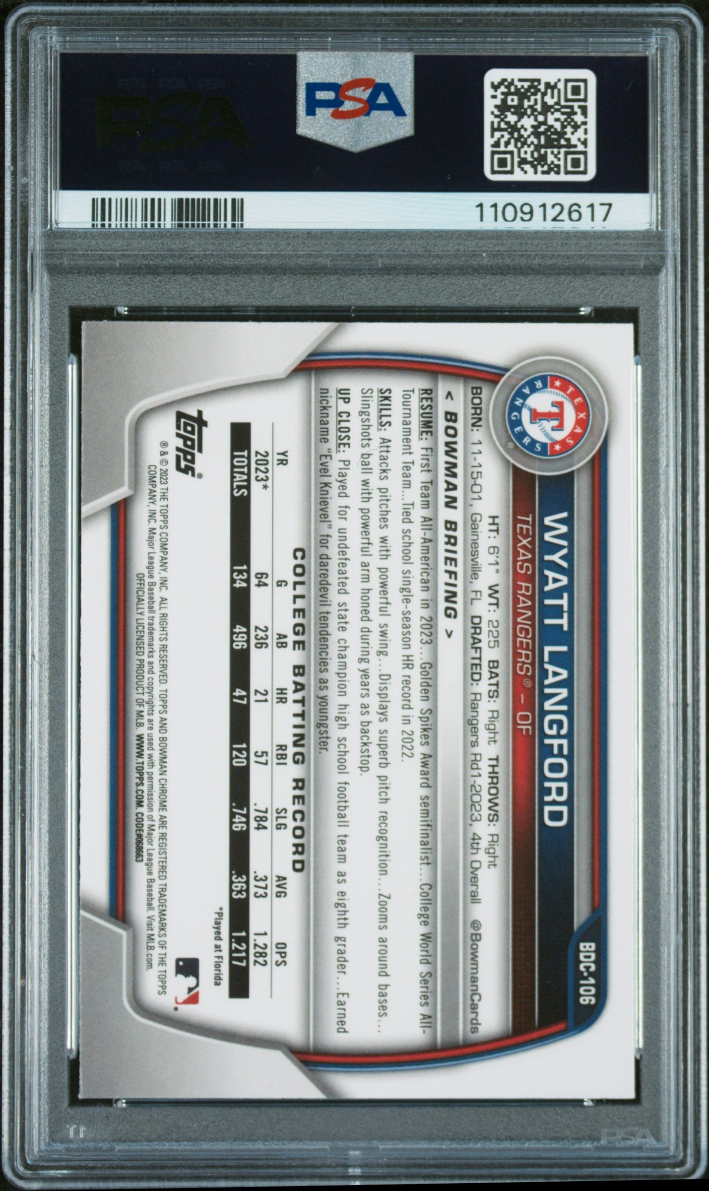 2023 Bowman Draft Wyatt Langford #BDC106 Chrome Sparkle Refractor PSA 9