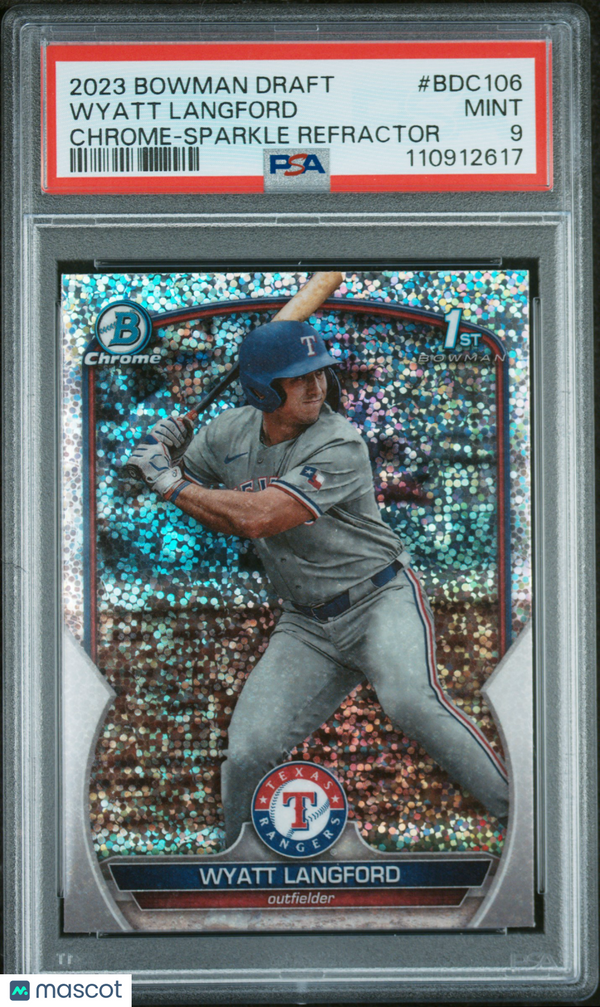 You are purchasing a 2023 Bowman Draft Baseball Wyatt Langford #BDC106 Chrome Sparkle Refractor PSA 9. You will receive the exact item in the photographs. Thank you for looking. Listed With Mascot.